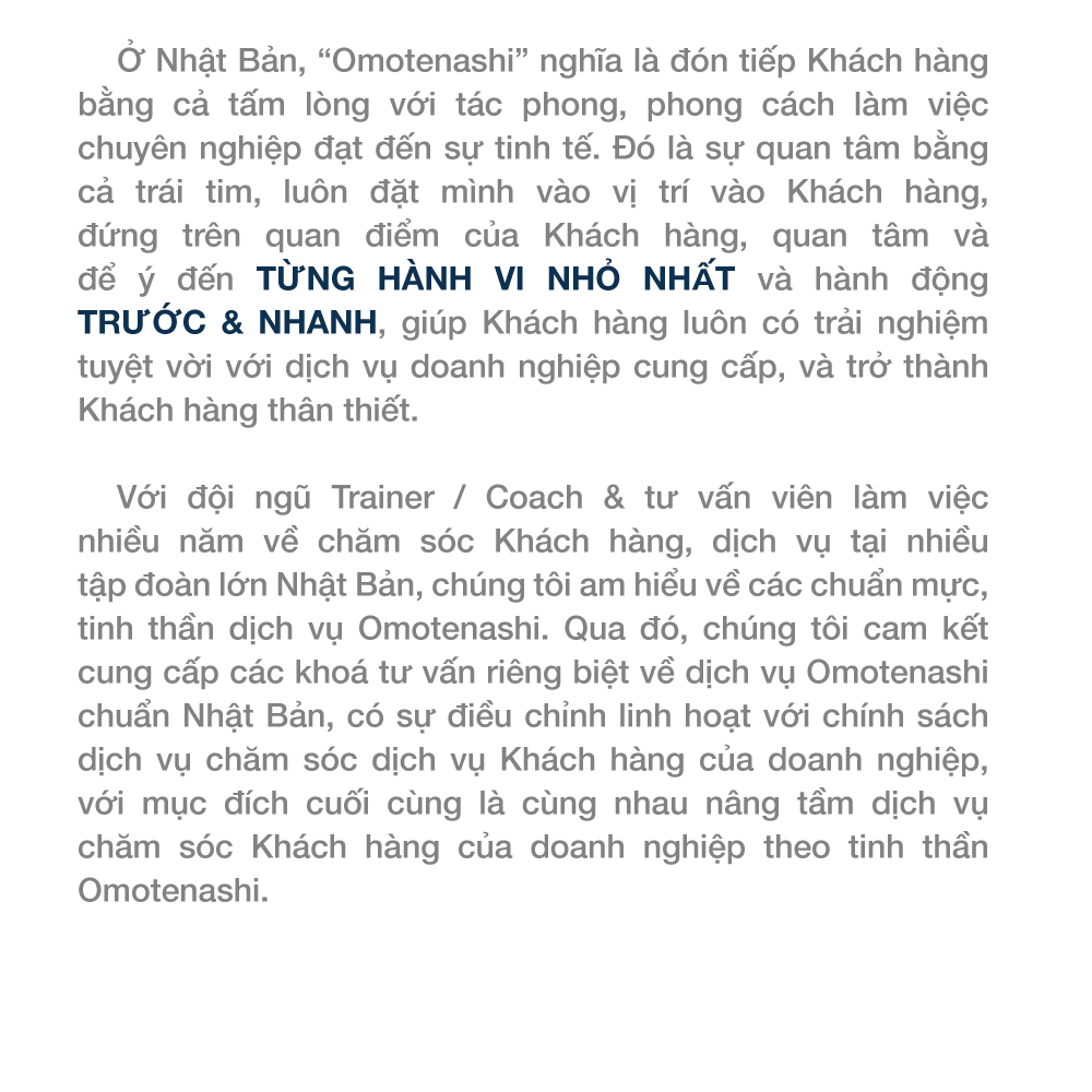 Văn hoá phục vụ khách hàng Omotenashi, mang lại trải nghiệm tuyệt vời cho Khách hàng theo chuẩn dịch vụ Omotenashi